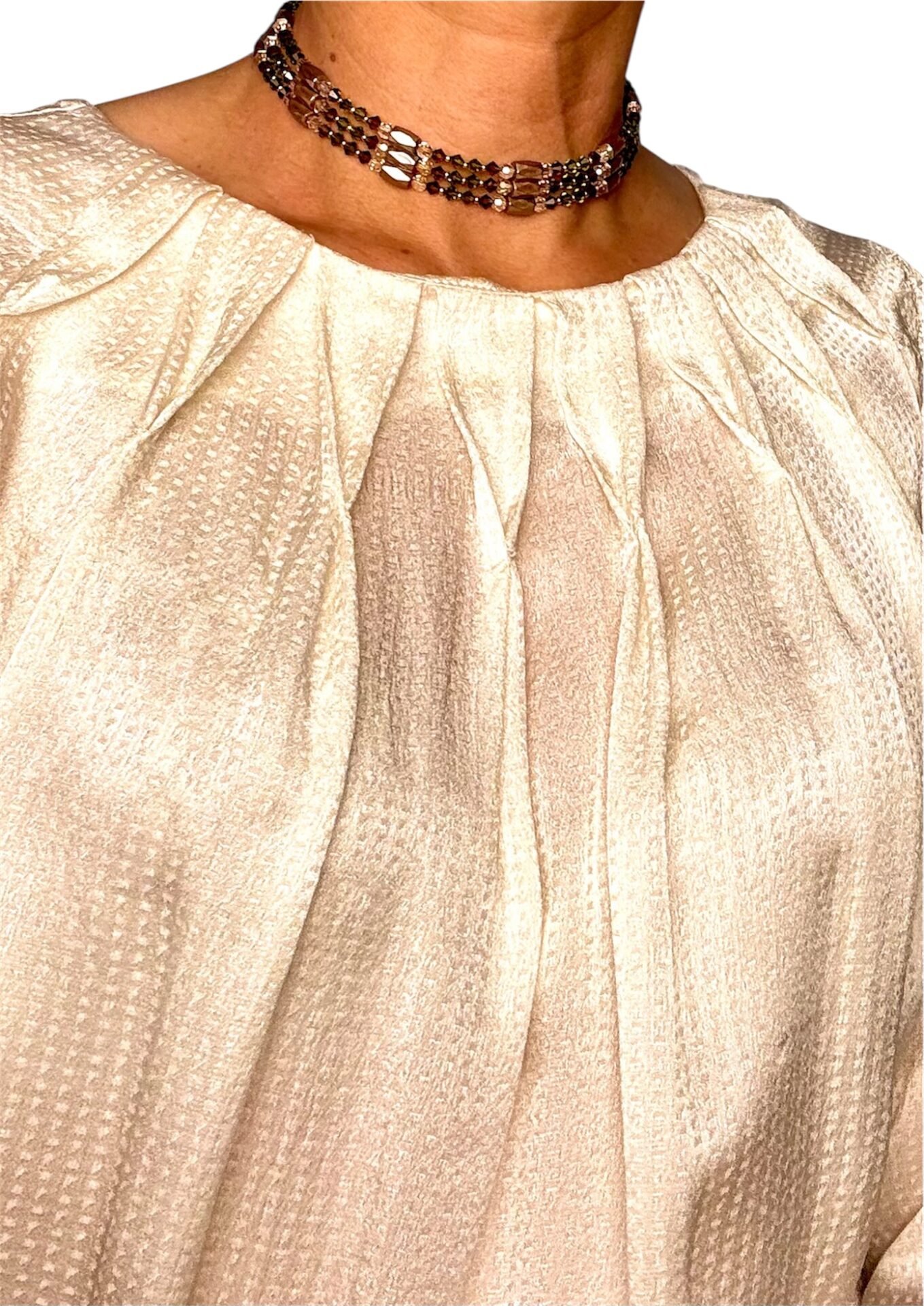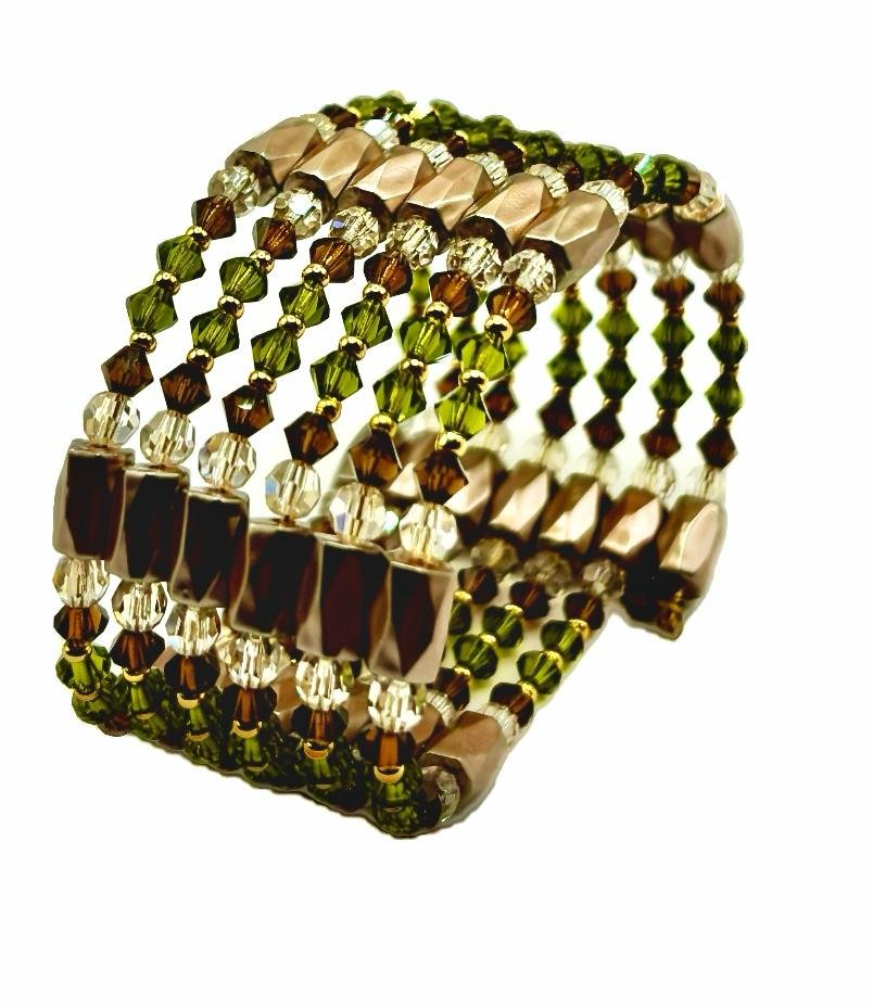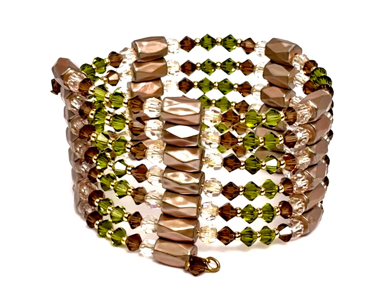 Lenis è un bracciale magnetico metallizzato beige, cristalli Preciosa® marrone, verde oliva e champagne. Rocailles 24K Preciosa®.