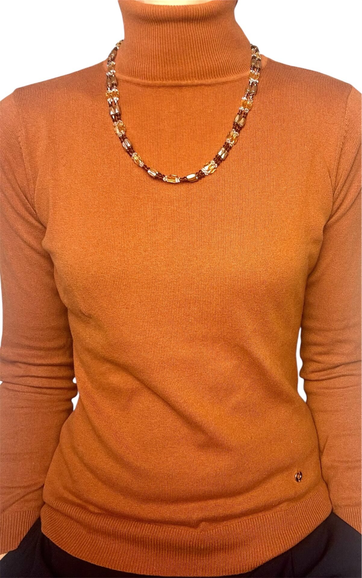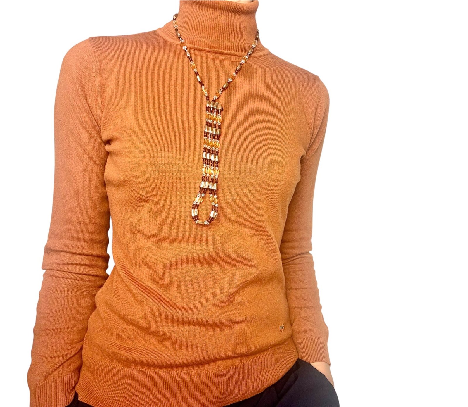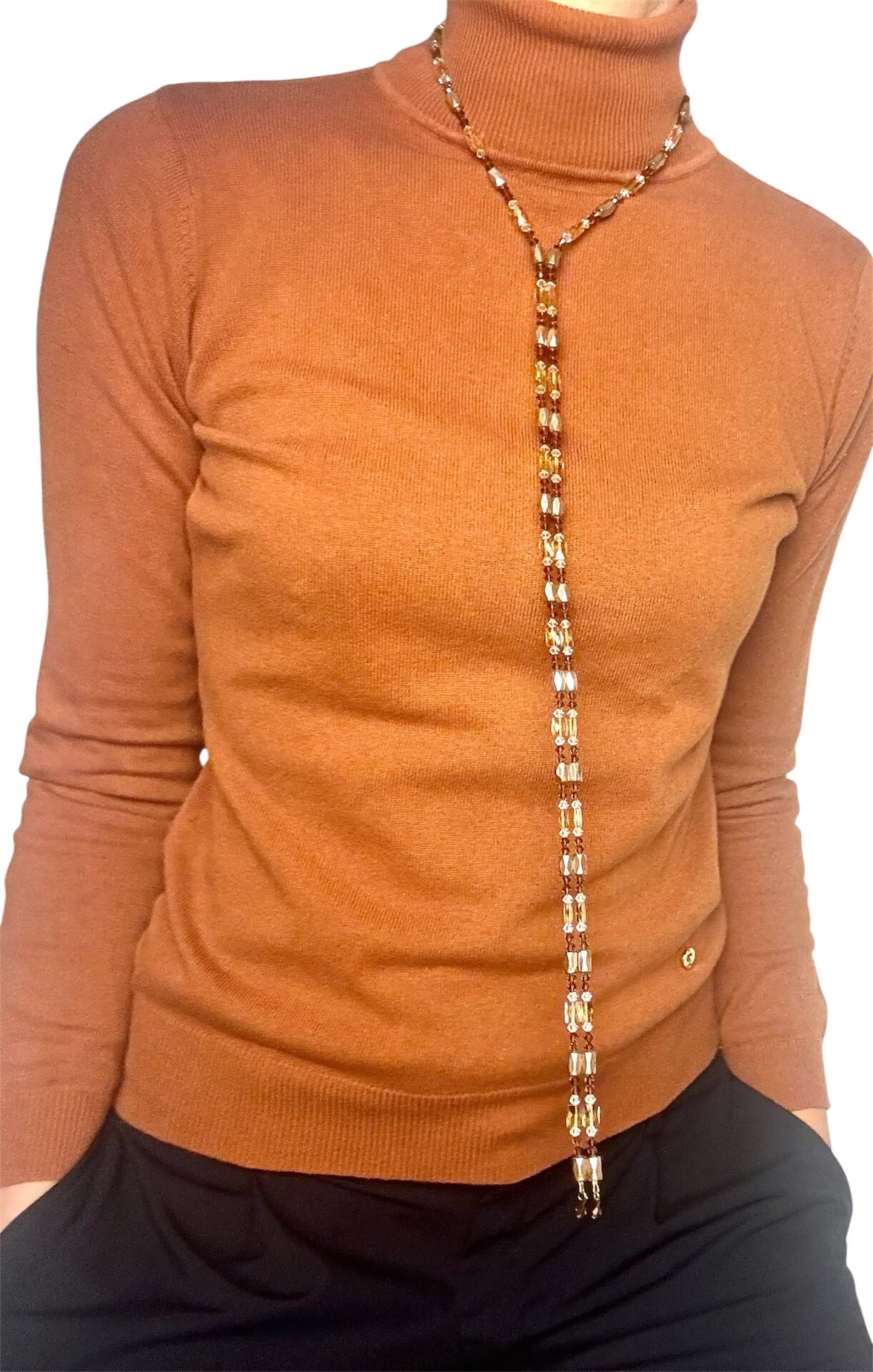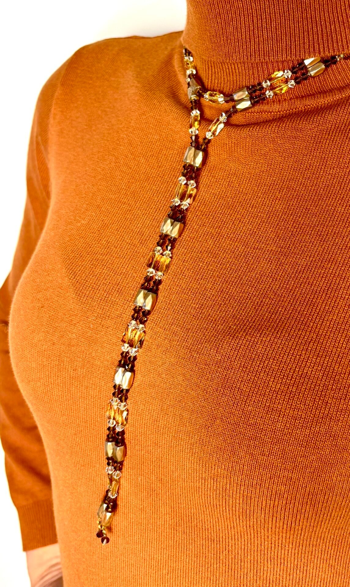 Gioiello che ricorda la sabbia, grazie alla fusione dell’ocra con il marrone caffè e il bianco trasparente. Riflessi dorati e una luce calda emergono quando il gioiello si muove. Un accessorio che racconta calore, affidabilità e gusto per i dettagli.